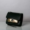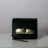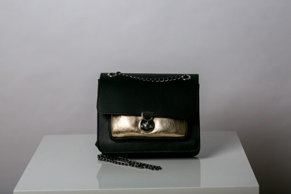 Geanta din piele naturala neagra cu buzunar auriu, este o geanata pe care o poti purta si pe umar si ca o bandoliera.Are un lant reglabil si un accesoriu la buzur ca si sistem de inchidere