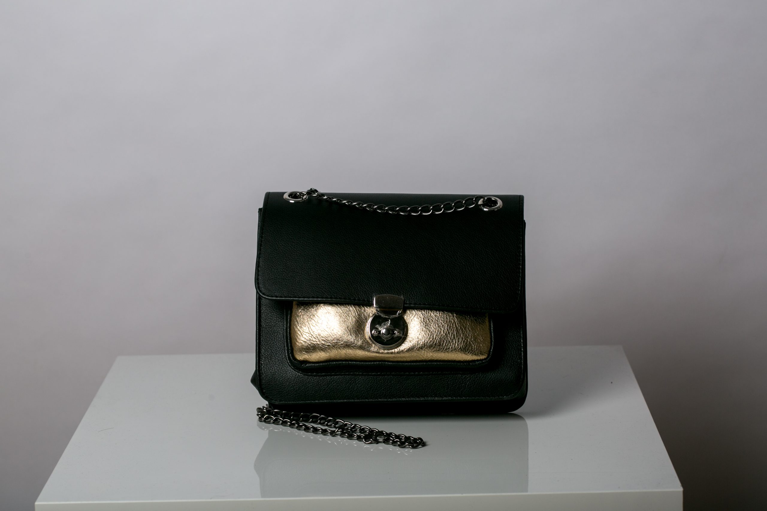 Geanta piele naturala negru cu buzunar auriu Model 681B